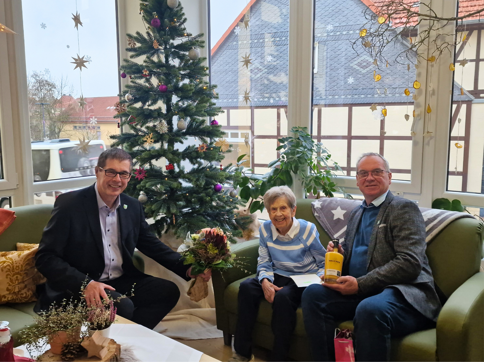 Einen Tag vor Weihnachten durfte Henni Kleeberg ihren 101. Geburtstag feiern. Bürgermeister Andreas Fernkorn und Ortschaftsbürgermeister Siegfried Fahrig besuchten die Eichsfelderin im Altenpflegezentrum “Hl. Louise” in Dingelstädt und gratulierten ihr ganz herzlich.