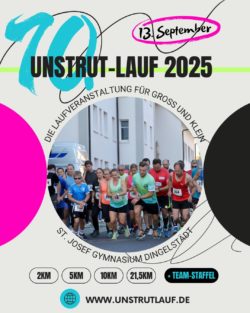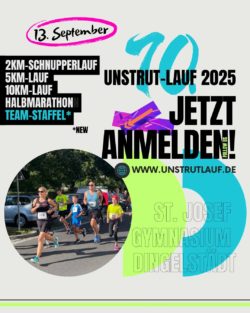 Am 13.09.2025 lädt das St. Josef Gymnasium zum 10. Unstrutlauf ein – einer Laufveranstaltung für die ganze Familie! Ob 5 km, 10 km oder Halbmarathon: Auf landschaftlich schöner Strecke entlang der Unstrut erwartet die Teilnehmenden ein sportliches Highlight mit Jubiläumsstimmung, Medaillen, Musik und guter Laune.