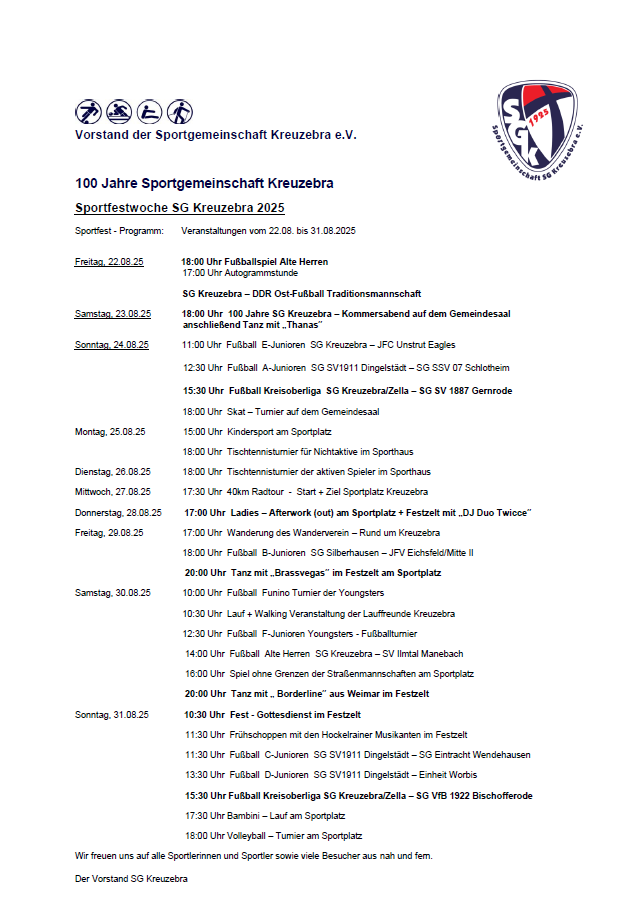 » Veranstaltung » 100 Jahre SG Kreuzebra 100 Jahre SG Kreuzebra Datum/Zeit Date(s) - 22. August 2025 - 31. August 2025Ganztägig Kategorien Highlights Kreuzebra Stadt Dingelstädt