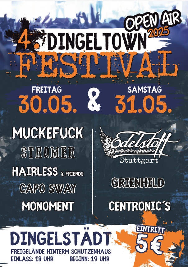 Am Freitag, den 30.05.2025 und Samstag, den 31.05.2025 findet unser „4. Dingeltown Musikfestival“ erneut hinter dem Schützenhaus in Dingelstädt statt.