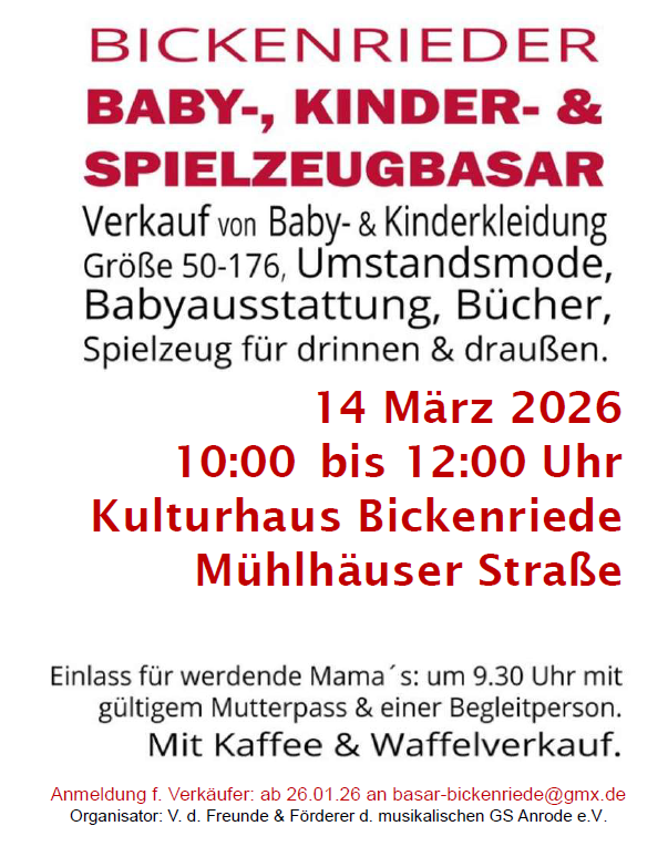 » Veranstaltung » Bickenrieder Baby-, Kinder- & Spielzeugbasar Bickenrieder Baby-, Kinder- & Spielzeugbasar Datum/Zeit Date(s) - 14. März 202610:00 - 12:00 Veranstaltungsort Ortschaft Bickenriede Kategorien Bickenriede