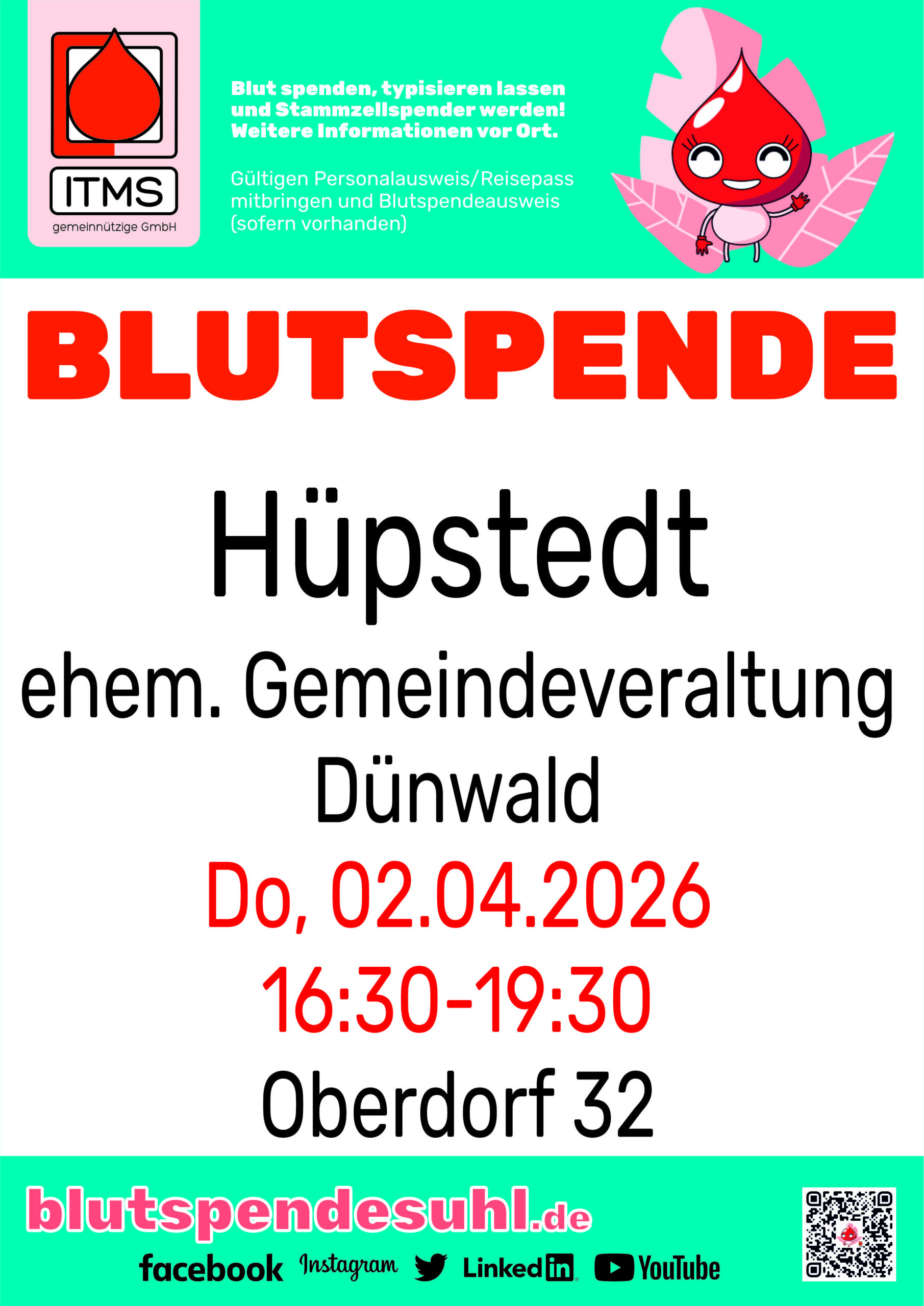 » Veranstaltung » Blutspende in Hüpstedt Blutspende in Hüpstedt Datum/Zeit Date(s) - 2. April 202616:30 - 19:30 Veranstaltungsort Ortschaft Hüpstedt Kategorien Hüpstedt