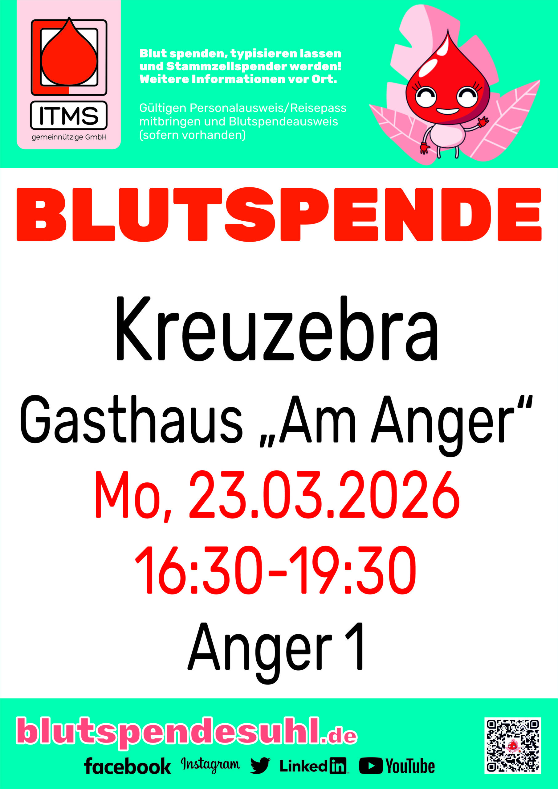 » Veranstaltung » Blutspende in Kreuzebra Blutspende in Kreuzebra Datum/Zeit Date(s) - 23. März 202616:30 - 19:30 Veranstaltungsort Ortschaft Kreuzebra Kategorien Dingelstädt Kreuzebra