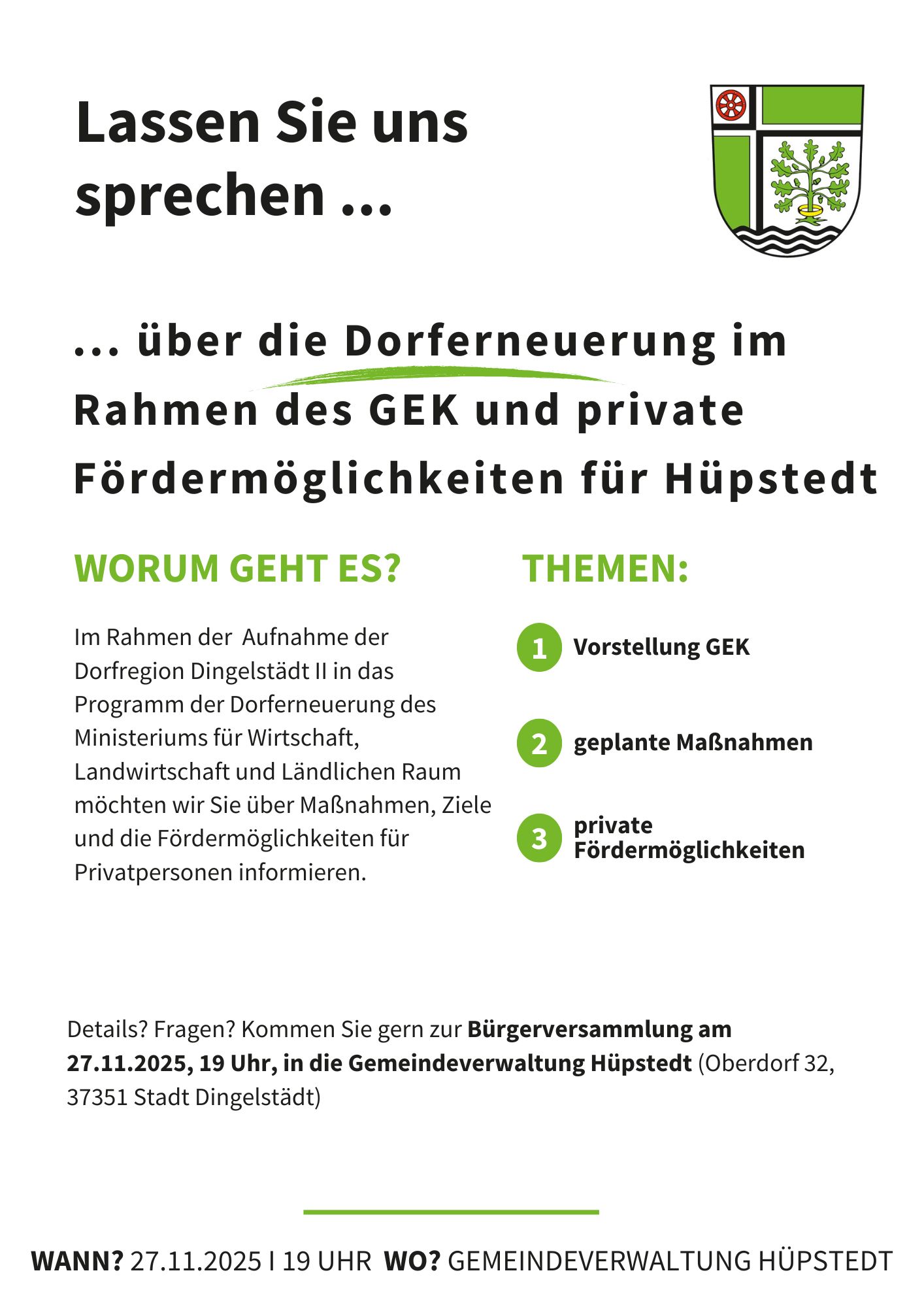 » Veranstaltung » Bürgerversammlung in Hüpstedt Bürgerversammlung in Hüpstedt Datum/Zeit Date(s) - 27. November 202519:00 - 21:00 Veranstaltungsort Ortschaft Hüpstedt Kategorien Dingelstädt Hüpstedt