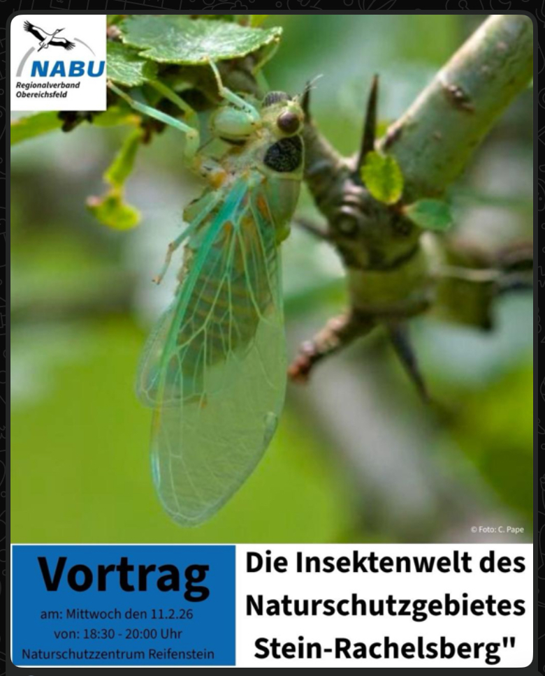 » Veranstaltung » Der NABU lädt ein – “Die Insektenwelt des Naturschutzgebietes Stein-Rachelsberg” Der NABU lädt ein – “Die Insektenwelt des Naturschutzgebietes Stein-Rachelsberg” Datum/Zeit Date(s) - 11. Februar 202618:30 - 20:00 Kategorien Highlights