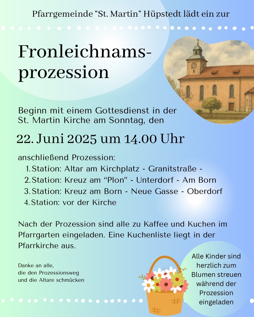 » Veranstaltung » Fronleichnamsprozession Fronleichnamsprozession Datum/Zeit Date(s) - 22. Juni 202514:00 Kategorien Hüpstedt Stadt Dingelstädt