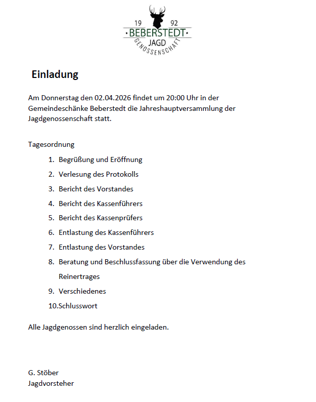 » Veranstaltung » Jahreshauptversammlung der Jagdgenossenschaft Beberstedt Jahreshauptversammlung der Jagdgenossenschaft Beberstedt Datum/Zeit Date(s) - 2. April 202620:00 - 23:59 Veranstaltungsort Ortschaft Beberstedt Kategorien Beberstedt