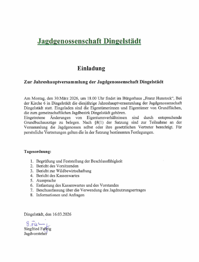 » Veranstaltung » Jahreshauptversammlung der Jagdgenossenschaft Dingelstädt Jahreshauptversammlung der Jagdgenossenschaft Dingelstädt Datum/Zeit Date(s) - 30. März 202618:00 - 21:00 Kategorien Dingelstädt