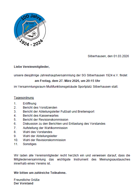 » Veranstaltung » Jahreshauptversammlung der SG Silberhausen Jahreshauptversammlung der SG Silberhausen Datum/Zeit Date(s) - 27. März 202620:15 - 22:15 Kategorien Silberhausen