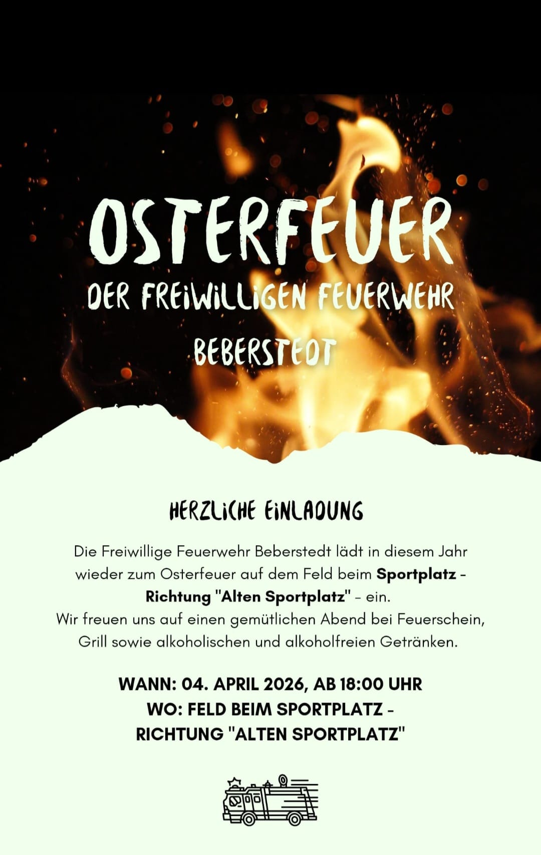 » Veranstaltung » Osterfeuer Osterfeuer Datum/Zeit Date(s) - 4. April 202618:00 - 23:45 Veranstaltungsort Ortschaft Beberstedt Kategorien Beberstedt