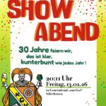 13.02.202613. Februar 2026 - 14. Februar 2026 @ 20:11 - 1:30 - Der KGV lädt herzlich ein- beim Showabend dabei zu sein. im Gemeindesaal "Zum Esel" Silberhausen Dieser findet am Freitag, den 13-02-2026 statt- Dann feiern wir mit Partystimmung satt. Alles wird geboten, was ein Narr gern hätt- Garde, Tanz, Sketch und Männerballett … Wir freuen uns auf Euch und ein Wiedersehen- Der Showabend mit Euch wird [...]