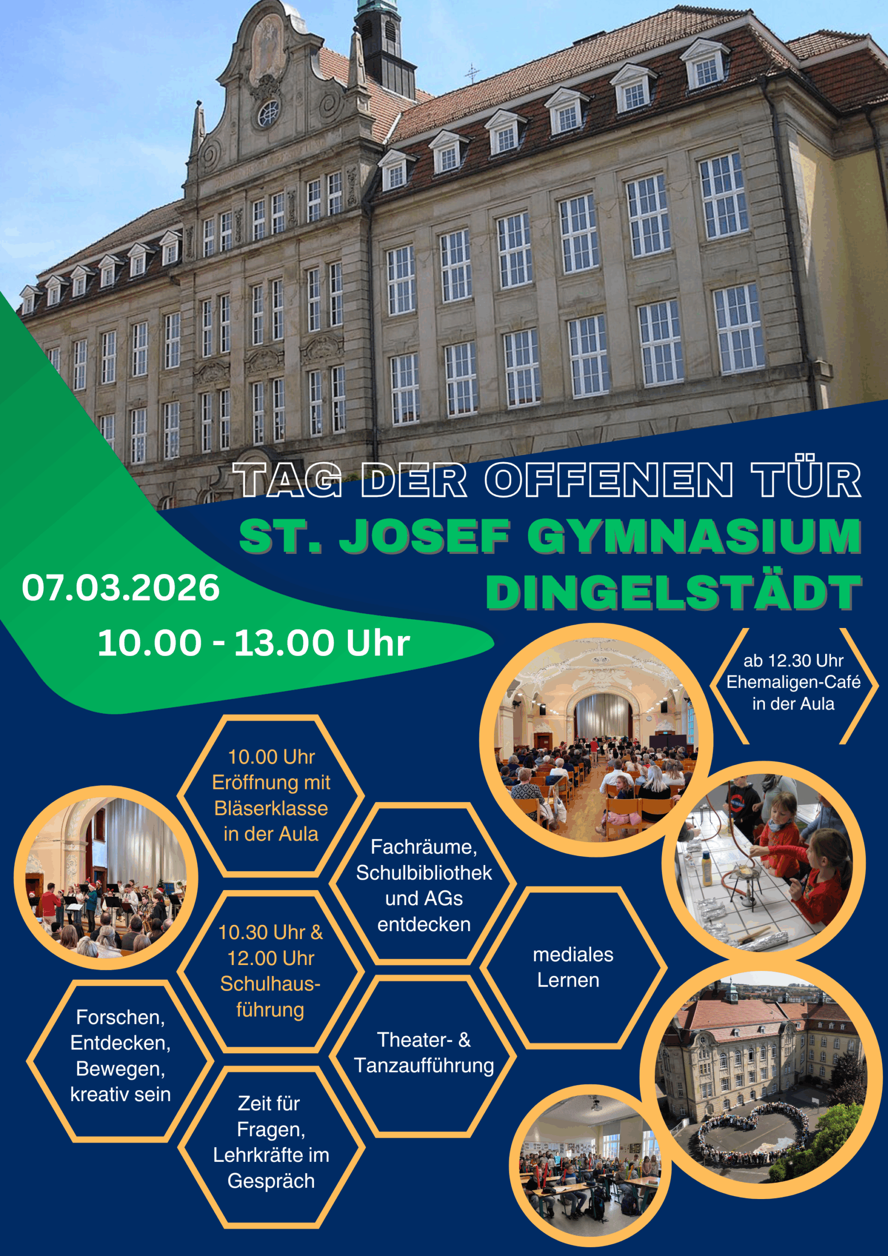 Am 7. März lädt das St. Josef-Gymnasium zum Tag der Offenen Tür ein. Zwischen 10:00 und 13:00 Uhr stellen sich die einzelnen Fächer mit vielfältigen Einblicken in den Unterrichtsalltag vor und stehen Lehrerinnen und Lehrer für Gespräche zur Verfügung. Hierzu sind alle Fachräume geöffnet inklusive der Schulbibliothek. Um 10:00 Uhr wird der ereignisreiche Tag mit der Aufführung der Bläserklasse musikalisch eingeleitet und somit bereits das erste spezielle Angebot der Schule vorgestellt. Um 10:30 Uhr sowie 12:00 Uhr finden Führungen durch das Schulhaus statt. Kreative Einblicke versprechen zudem die Tanz- und Theateraufführungen. Somit rundet der Tag der Offenen Tür die Schnuppertage der Grundschulen ab, die im Januar und Februar stattfanden. Besuchten zu diesen Ereignissen ausschließlich die Kinder das Gymnasium, besteht nun die Möglichkeit, erste Eindrücke gemeinsam mit Eltern oder Großeltern zu vertiefen.