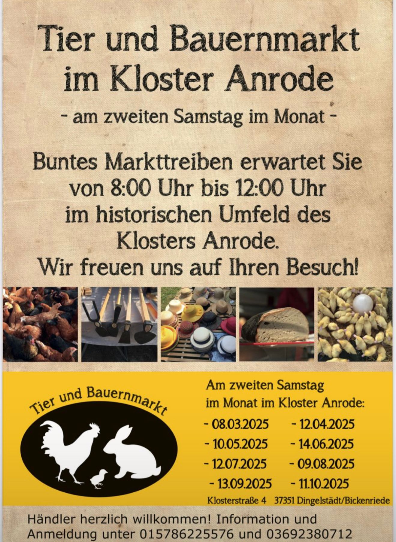 » Veranstaltung » Tier-und Bauernmarkt im Kloster Anrode Tier-und Bauernmarkt im Kloster Anrode Datum/Zeit Date(s) - 11. Oktober 20258:00 - 12:00 Kategorien Bickenriede Highlights Stadt Dingelstädt