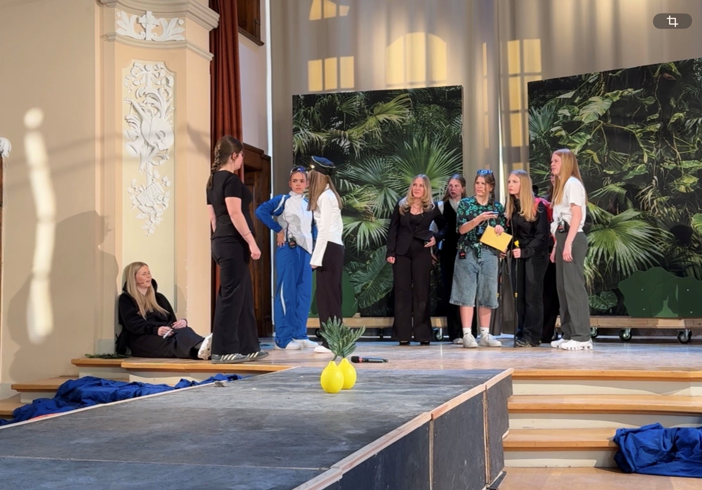 Auch die Gestaltung des Bühnenbilds übernahm die Gruppe selbstständig. Seit Beginn des Schuljahres wurden in aufwändiger und zeitintensiver Arbeit ein längerer Bühnensteg sowie transportable Bühnenbildelemente gebaut. “Wenn Sie also einen fähigen Handwerkertrupp daheim brauchen, ich kann Ihnen diesen wirklich nur empfehlen”, gibt Michael Gremler daher lachend dem Publikum einen Tipp mit auf den Weg.