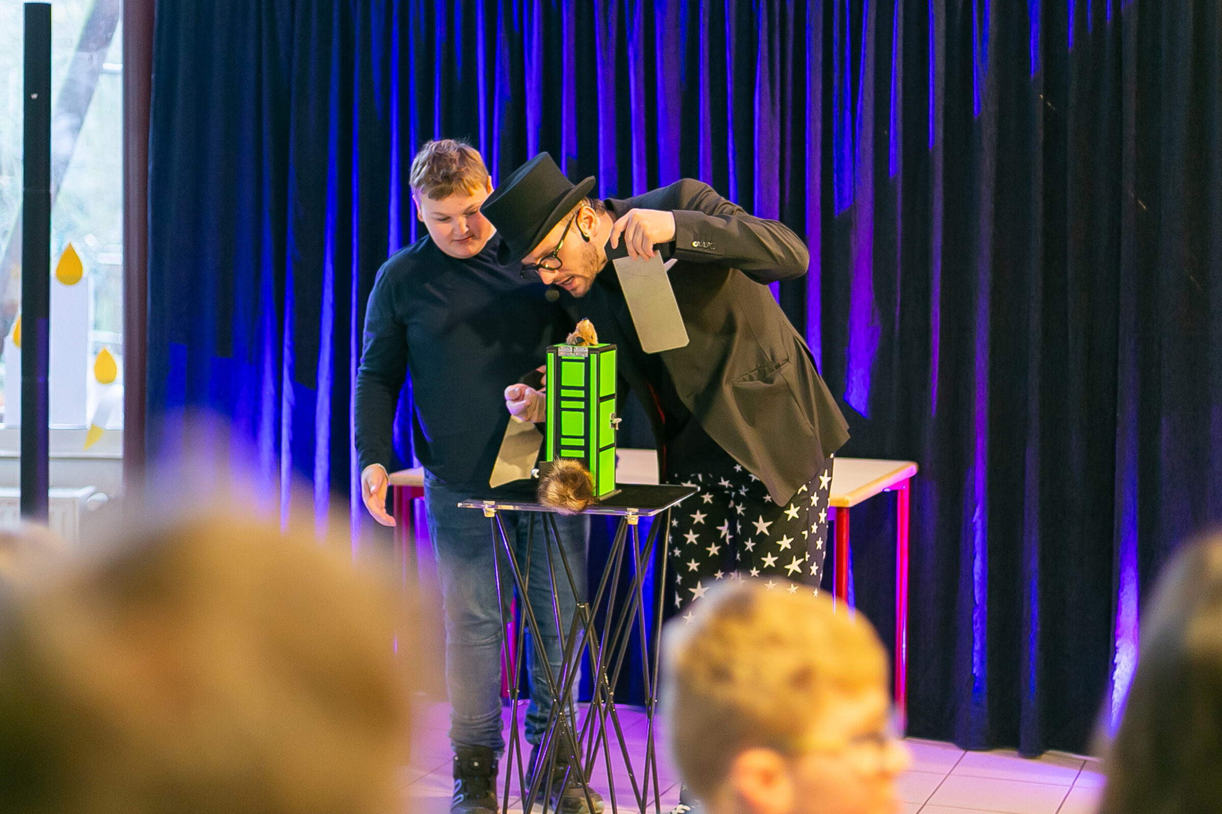 Oliver Jelias gewann schnell die Aufmerksamkeit der Kinder. Mit seiner ruhigen und einfühlsamen Art motivierte er sie zum Mitmachen und Ausprobieren. Für den Zauberkünstler war es das erste Projekt an einer Förderschule – mit durchweg positiver Resonanz. Am Ende präsentierten die Kinder – soweit sie sich trauten – ihre erlernten Kunststücke in einer gemeinsamen Zaubershow für alle Schülerinnen, Schüler und Lehrkräfte.