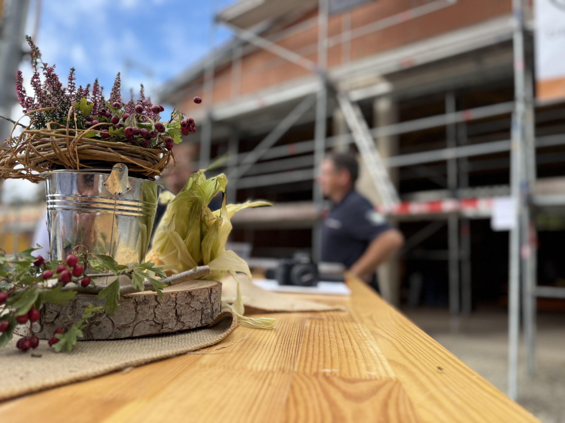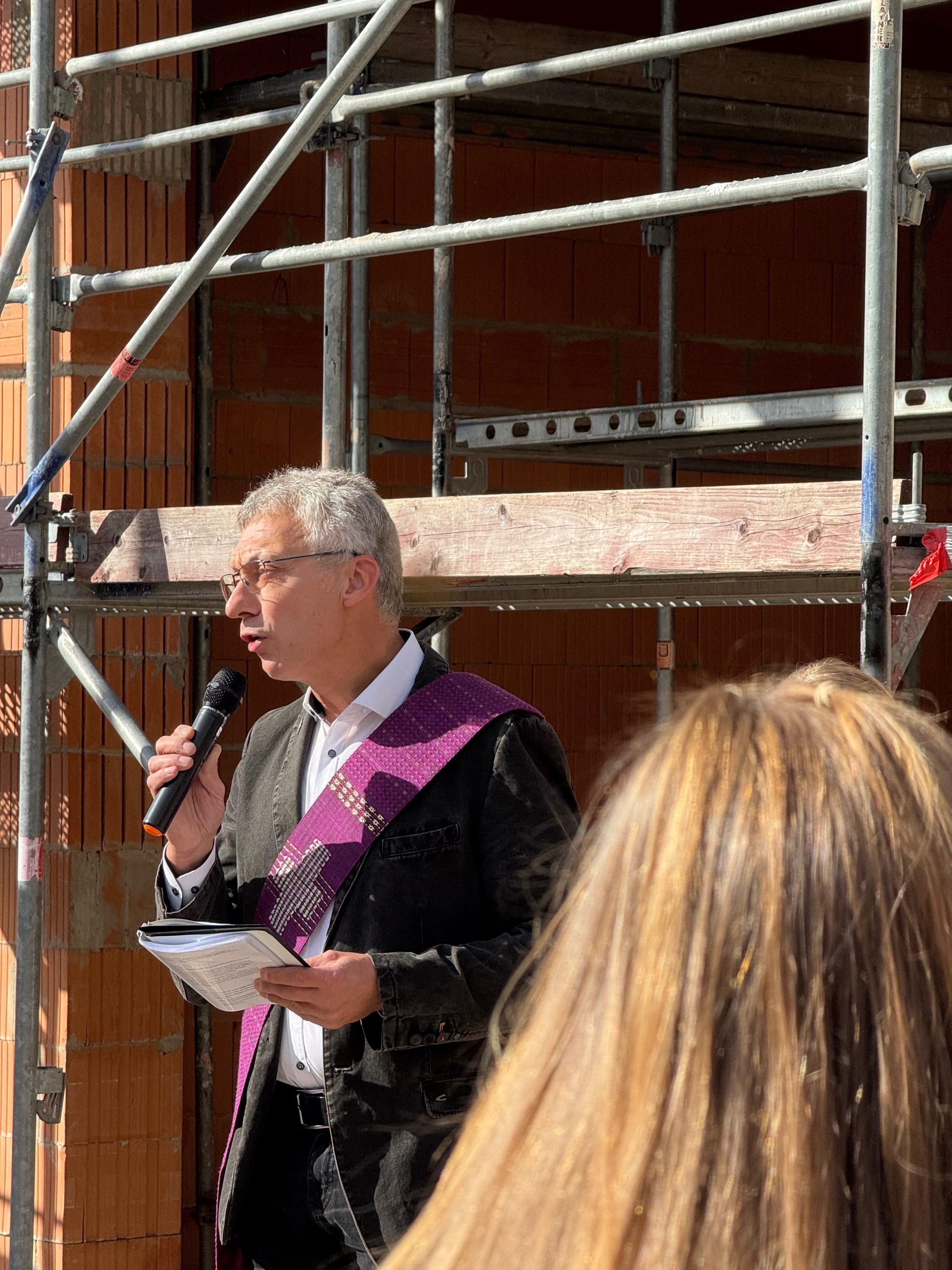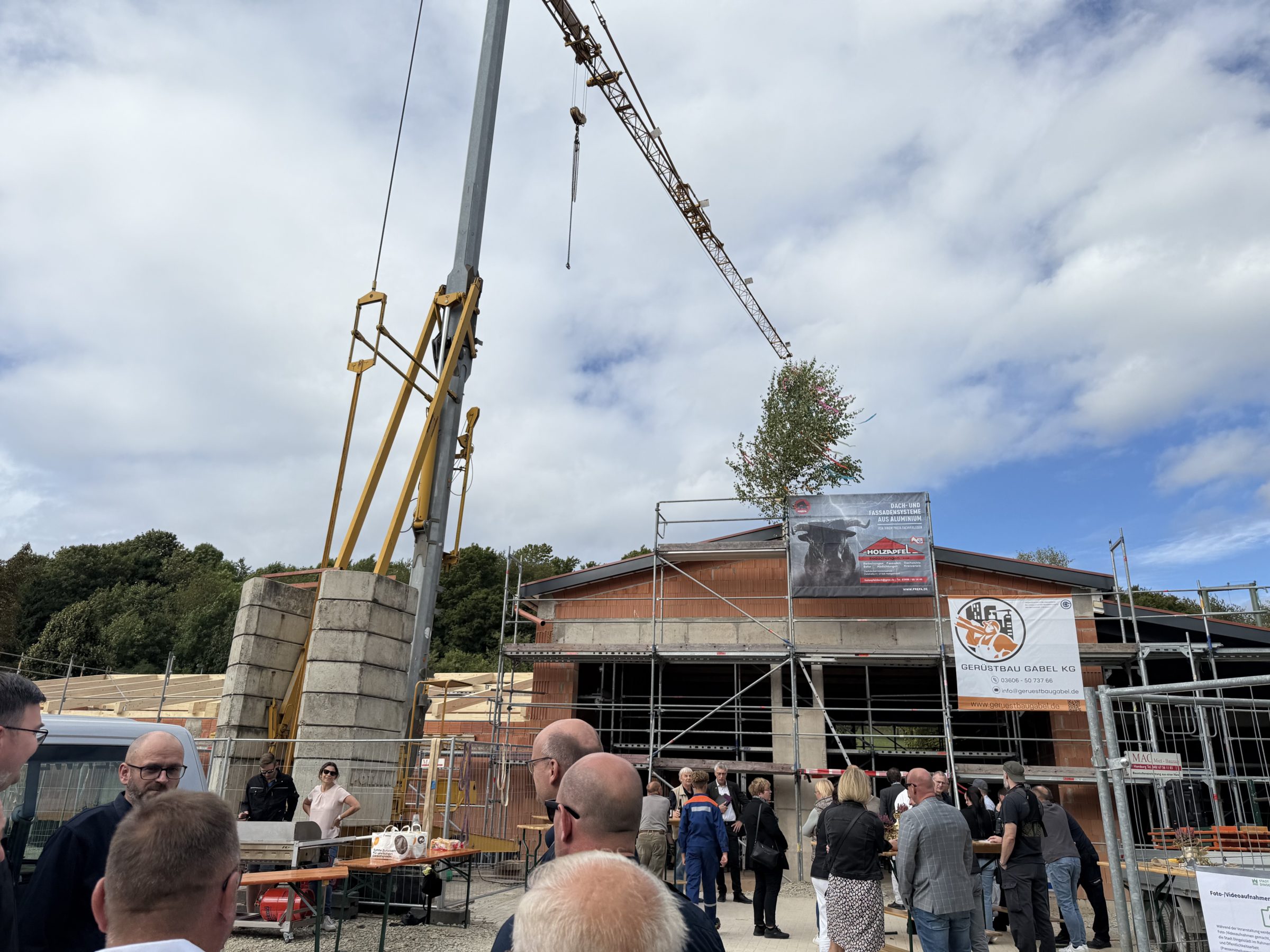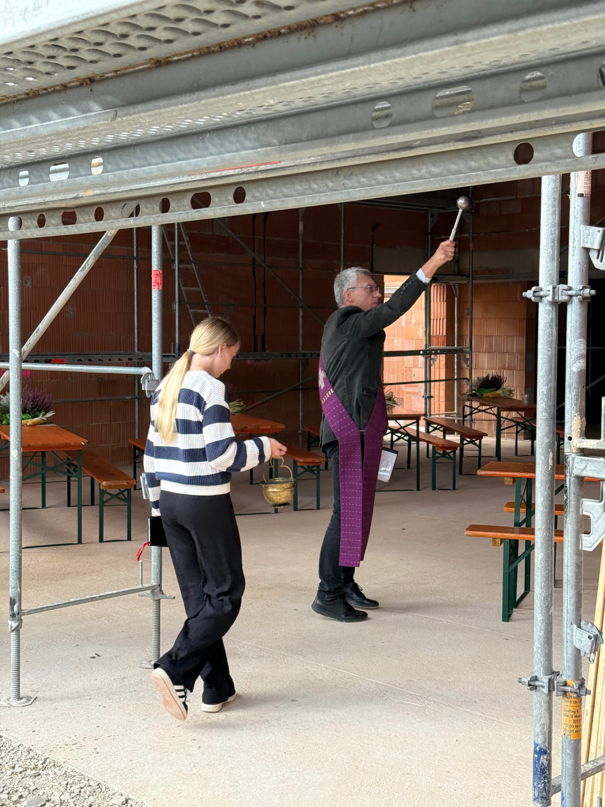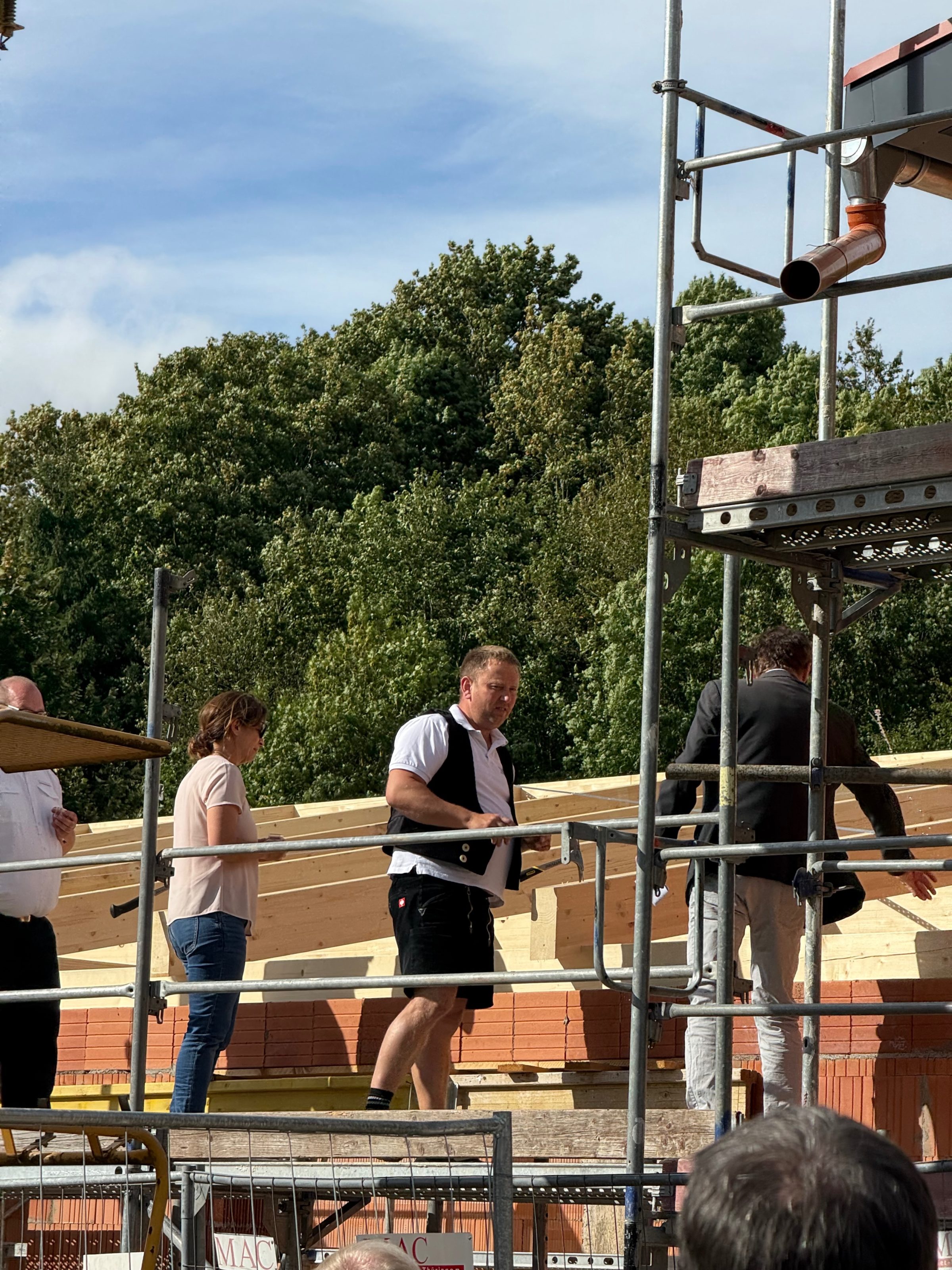Beim Richtfest Anfang September stellte Diakon Roland Schmerbauch das Gebäude und den weiteren Bau unter göttlichen Segen. Zimmermann Martin Struthmann durfte den traditionellen Richtspruch halten.