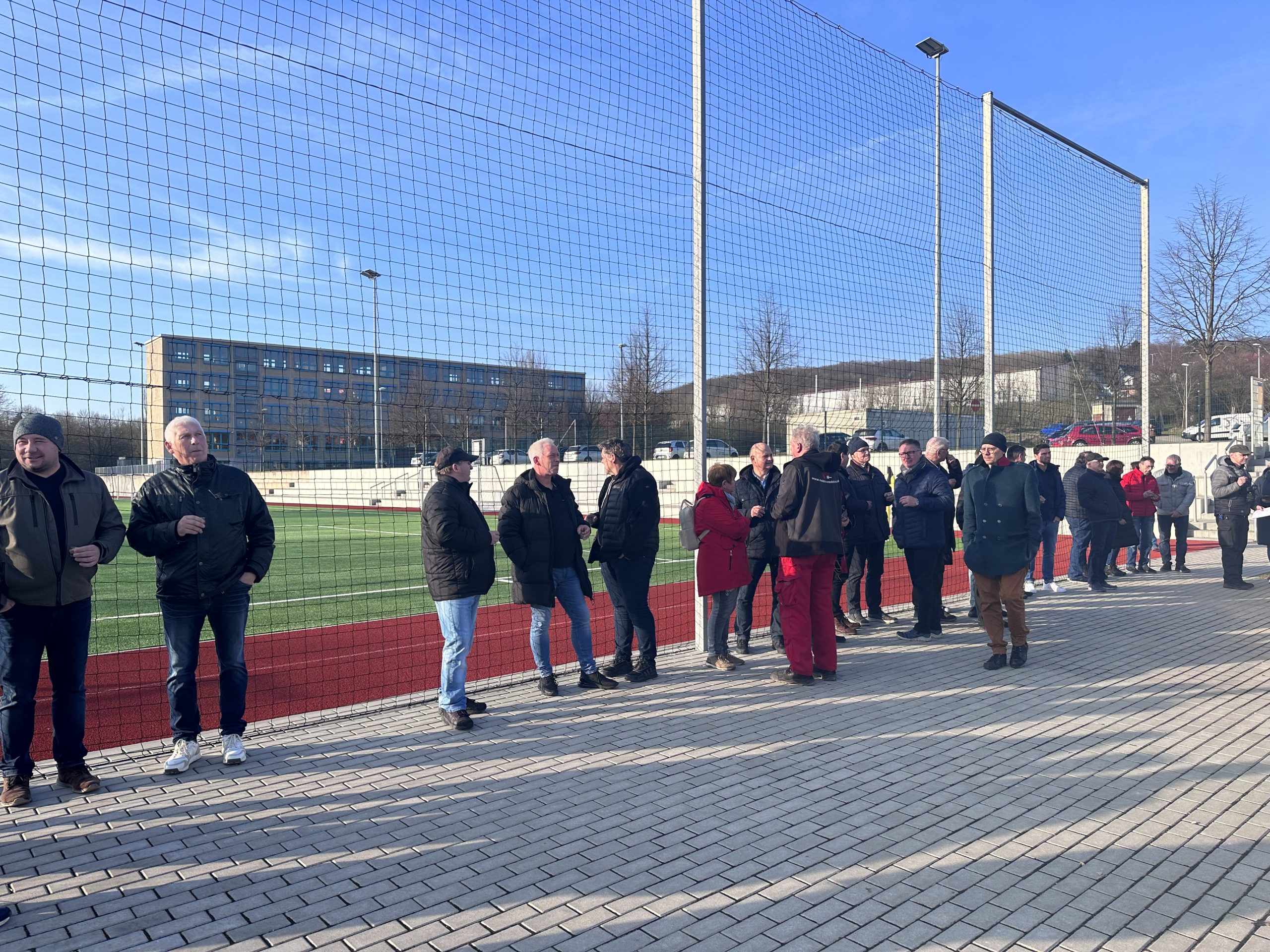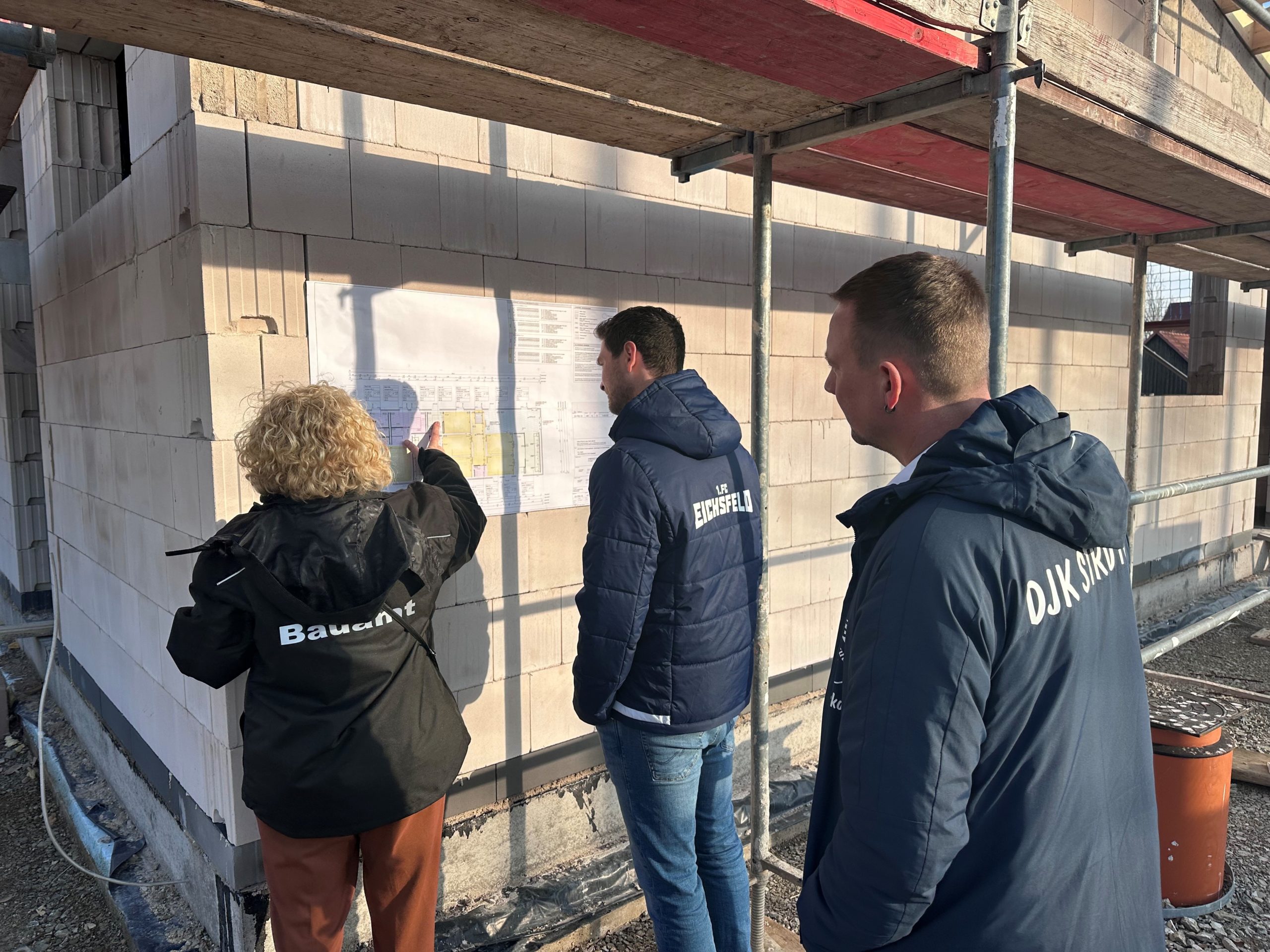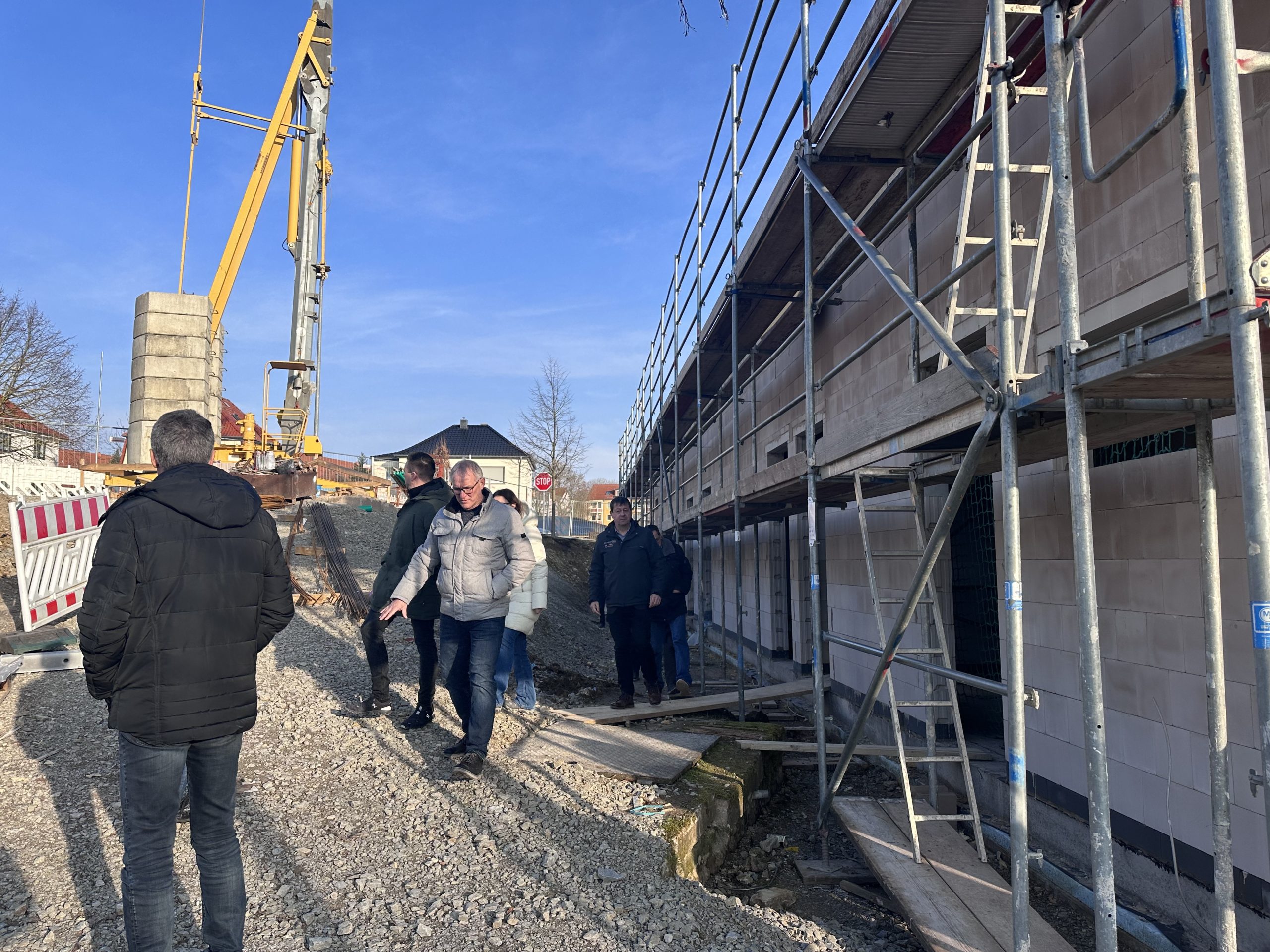 Ein erster großer Meilenstein in der Bauphase: das Richtfest am 27. Februar. Vereinsmitglieder aus dem Sport, Handwerker, Planer und politische Köpfe der Stadt kamen zusammen, um das bereits Geschaffene traditionell zu feiern. Seit Oktober 2023 laufen die Bauarbeiten. Den traditionellen Richtspruch trug hoch oben auf dem Dachstuhl Zimmermann Ralf Schneemann vor. An seiner Seite: Bürgermeister Andreas Fernkorn. Als Bauherr schlug er den obligatorischen Nagel ein. Nach diesem offiziellen Teil wartete eine Begehung des Gebäudes auf die Gäste, die Mitarbeiter des Bauamts beantworteten alle Fragen.