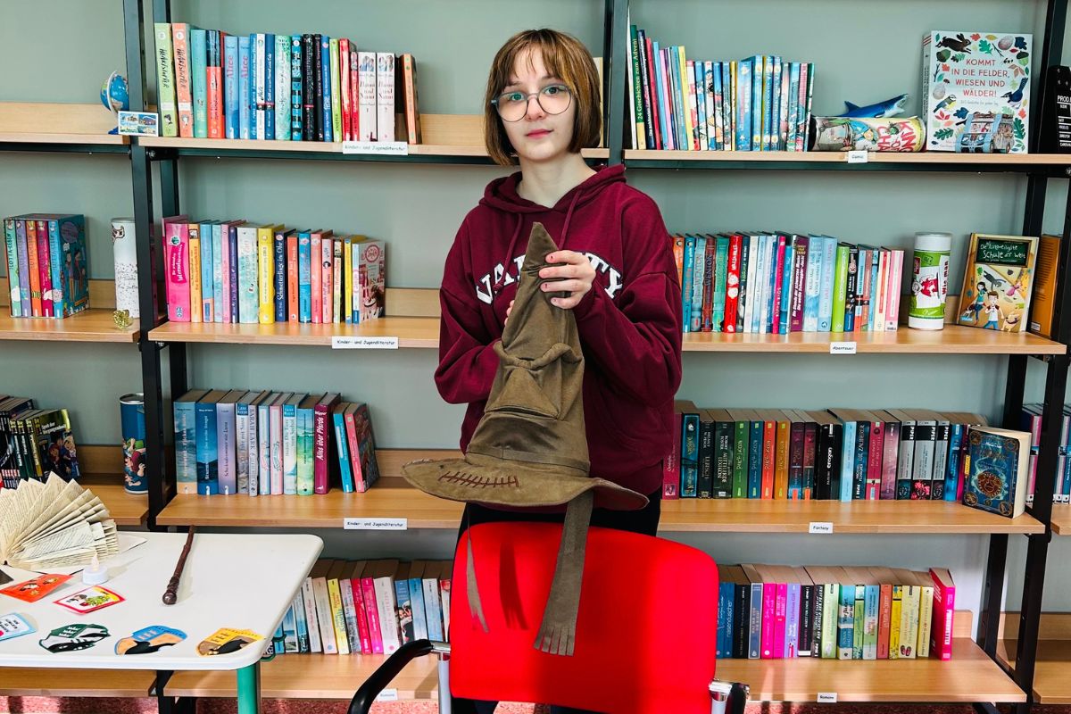 Auch die Schulbibliothek präsentierte sich vor Ort. Neben zahlreichen Angeboten wie Armbänder knüpfen, Lesezeichen basteln, Kratz- und Ausmalbildern, überzeugte auch die Harry Potter Ecke mit sprechendem Hut. Viele kleine, aber auch große Besucher besuchten uns an dem Tag.