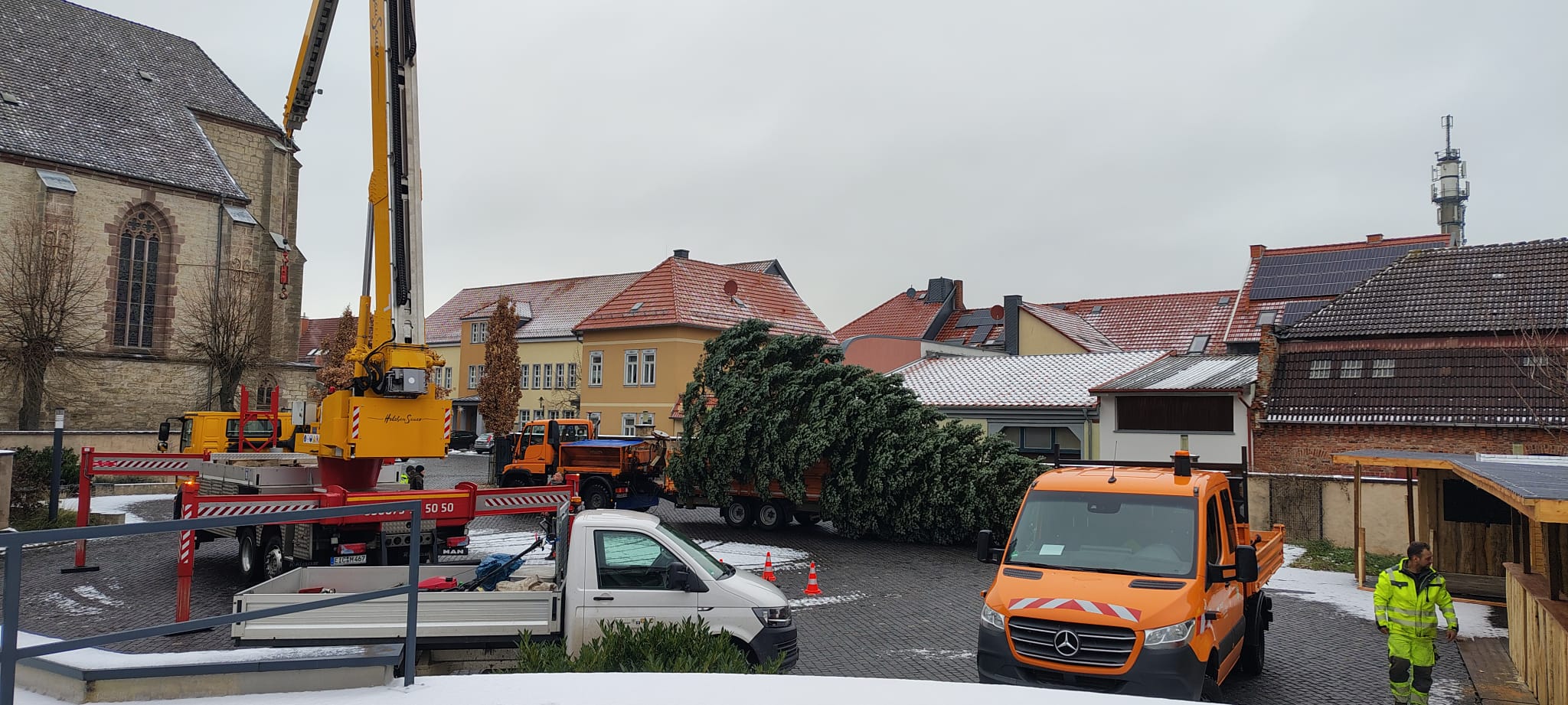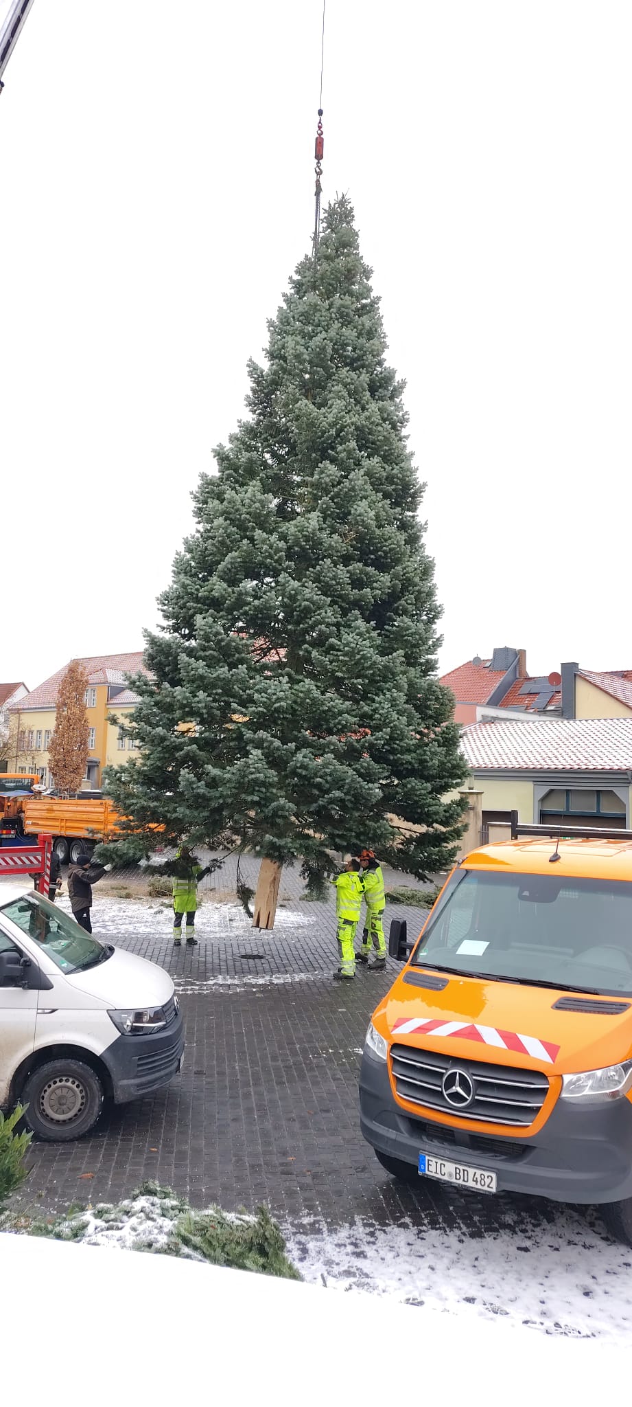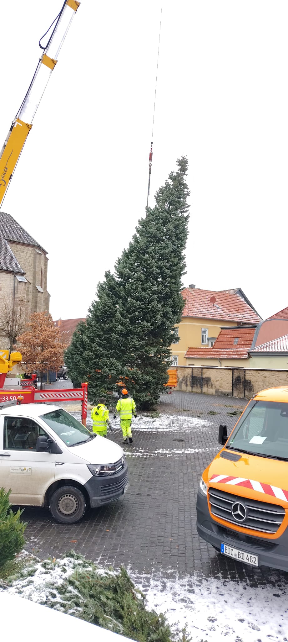 Pünktlich zum Start des Dingelstädter Weihnachtsmarktes am 1. Advents-Wochenende ist er aufgestellt: der diesjährige Weihnachtsbaum auf dem Rathaushof. Und er setzt gleich einen neuen Rekord. Die Zahlen sprechen für sich: 12 Meter Höhe, 2,6 Tonnen Gewicht – eine Colorado-Tanne, die schon beim Transport besonderes Fingerspitzengefühl verlangte.